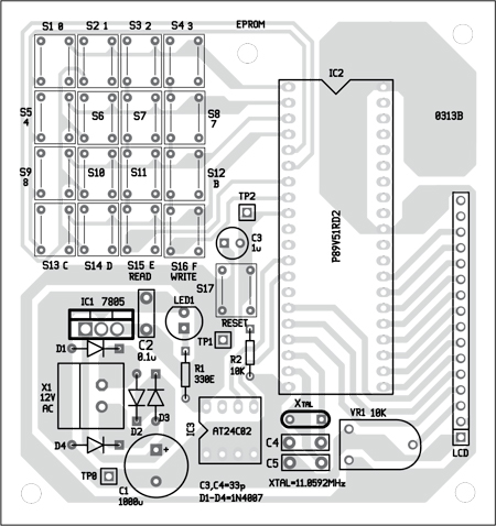 A single side PCB for the circuit is shown in Fig. 2 and its component layout in Fig. 3. Assemble the circuit on a PCB as it minimises time and assembly errors. Carefully assemble the components and double-check for any overlooked error. Use IC base for the microcontroller and the EEPROM. Before inserting the IC, check the supply voltage. Using preset VR1 set the LCD contrast for proper display.