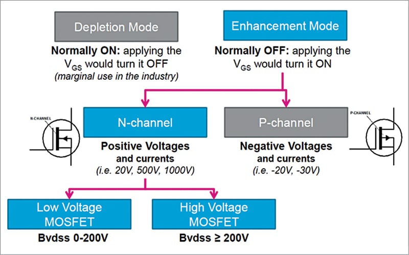 Depletion mode MOSFETs are normally on, and applying VGS voltage turns them off. Enhancement mode MOSFETs are normally off, and applying VGS voltage turns them on. The flow chart in Fig. 2 shows how different types of MOSFETs work.
