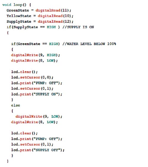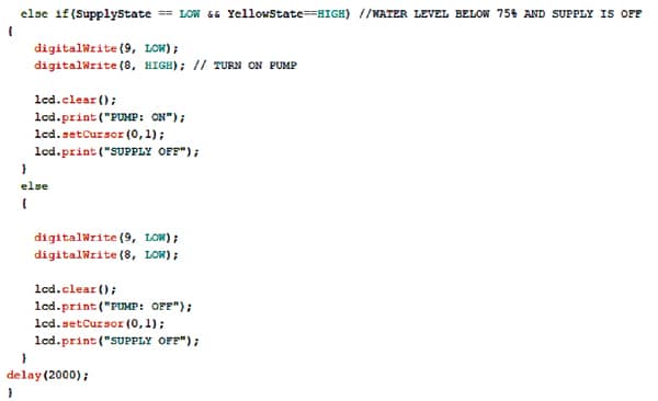 The data from this variable is further used to define if-else logic to control the solenoid and the water pump. The LCD used to display the state of the two water sources is controlled using I2C communication. The libraries, Wire.h and LiquidCrystal_I2C.h, are utilised for I2C communication with the LCD. After each loop, a delay of 2000ms is added in the execution of the code.