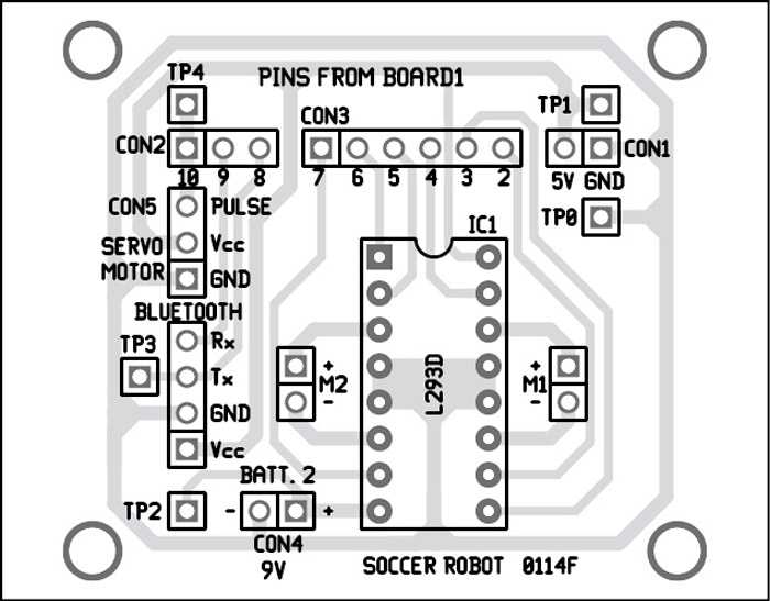 A single-side PCB for the soccer robot and its component layout is shown below. Assemble the circuit on the recommended PCB to save time and minimise assembly errors. Use IC base for motor driver IC1.
