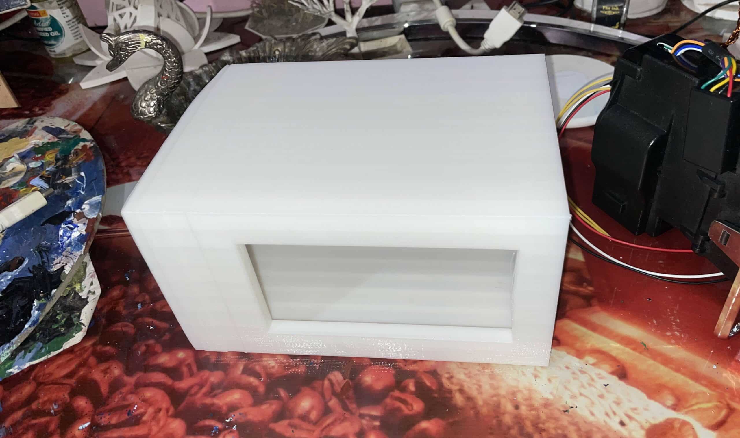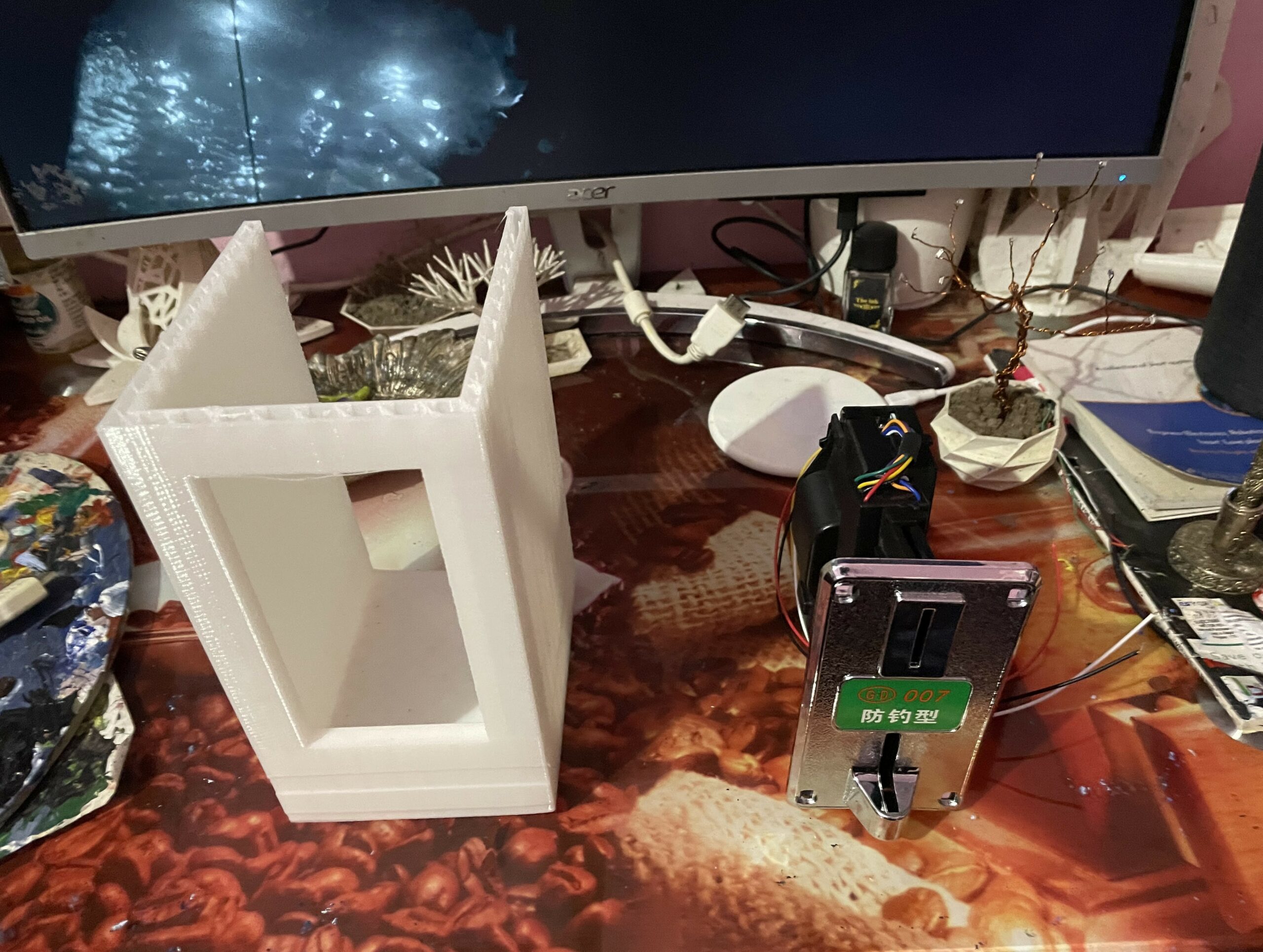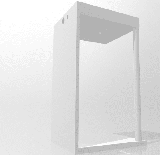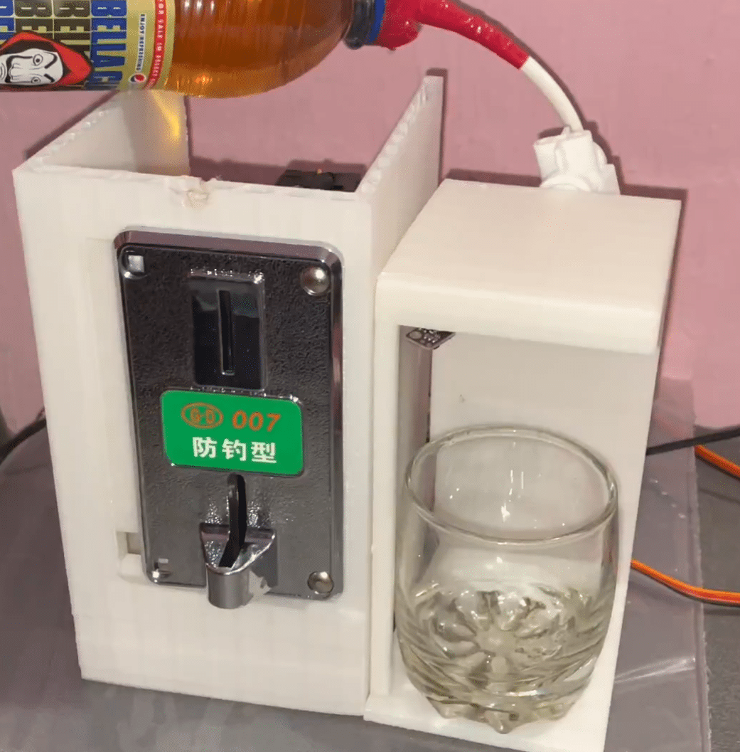You can 3D print or order from any online 3D printing service to have a vending machine as per your design preferences. Here, the vending machine has been designed in two parts: one for accepting the coin and another for offering the liquid. There are two holes at the side for passing the pipe and TOF sensor wires (to check the level of water poured into the drinking glass).