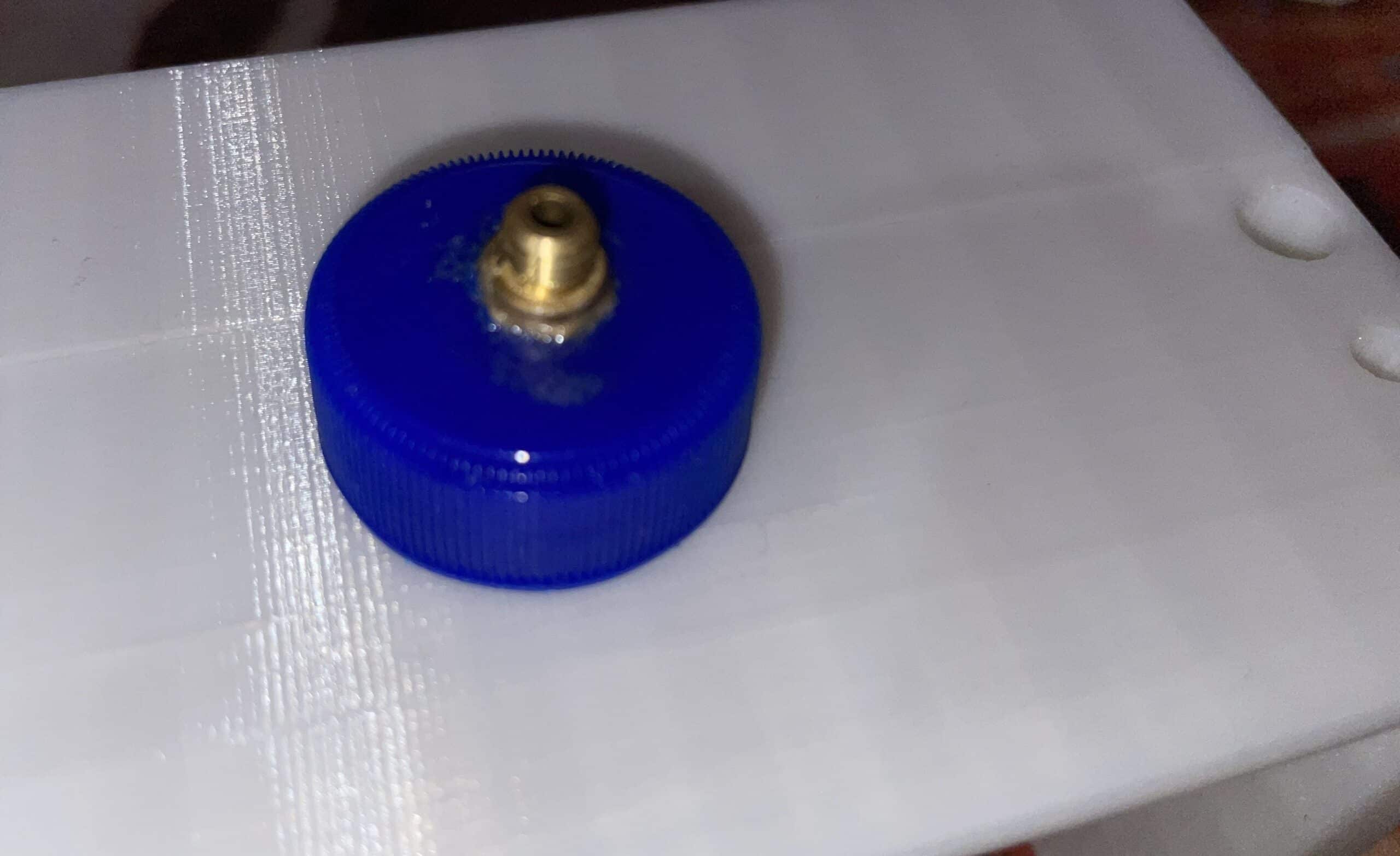 Next, prepare the liquid vending mechanism for which you need to cut the pipe and insert it in the inlets and outlets of the solenoid valve. Then insert one end of the pipe in the bottle through the hole or container holding the liquid and waterproof it to avoid any leakages. Here, I have used a bottle cap through which the pipe needs to be inserted.