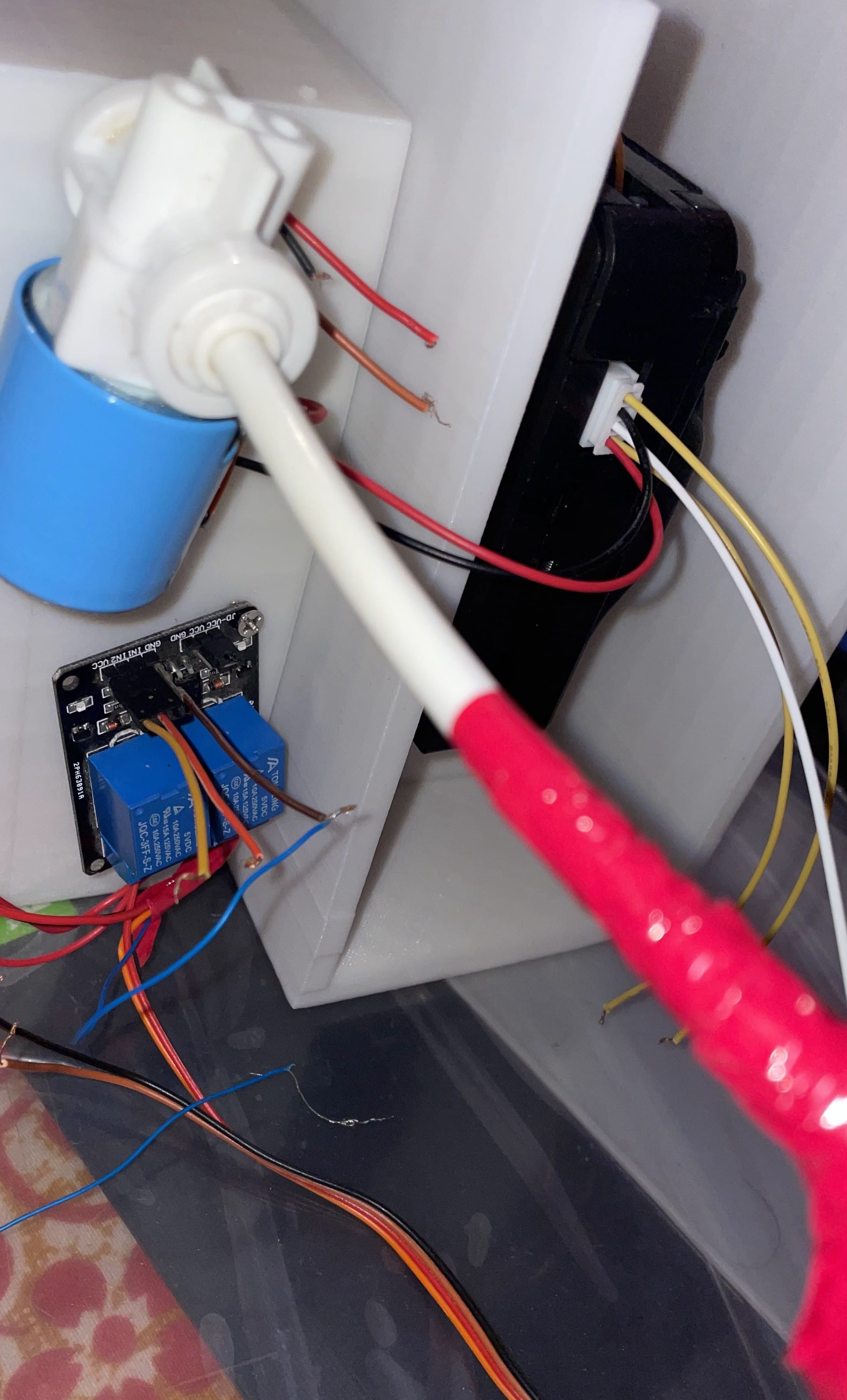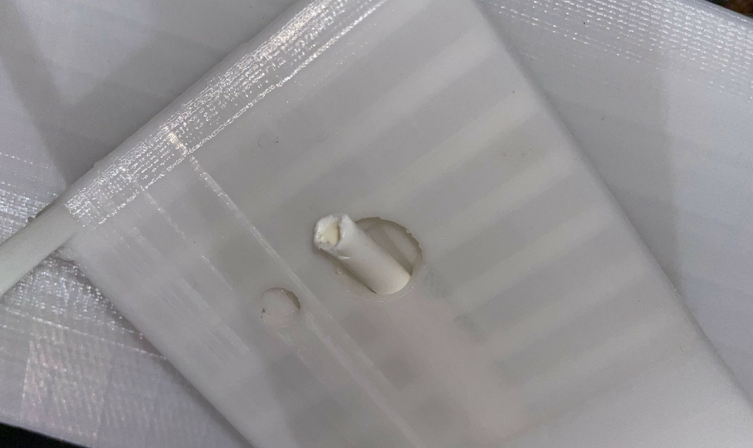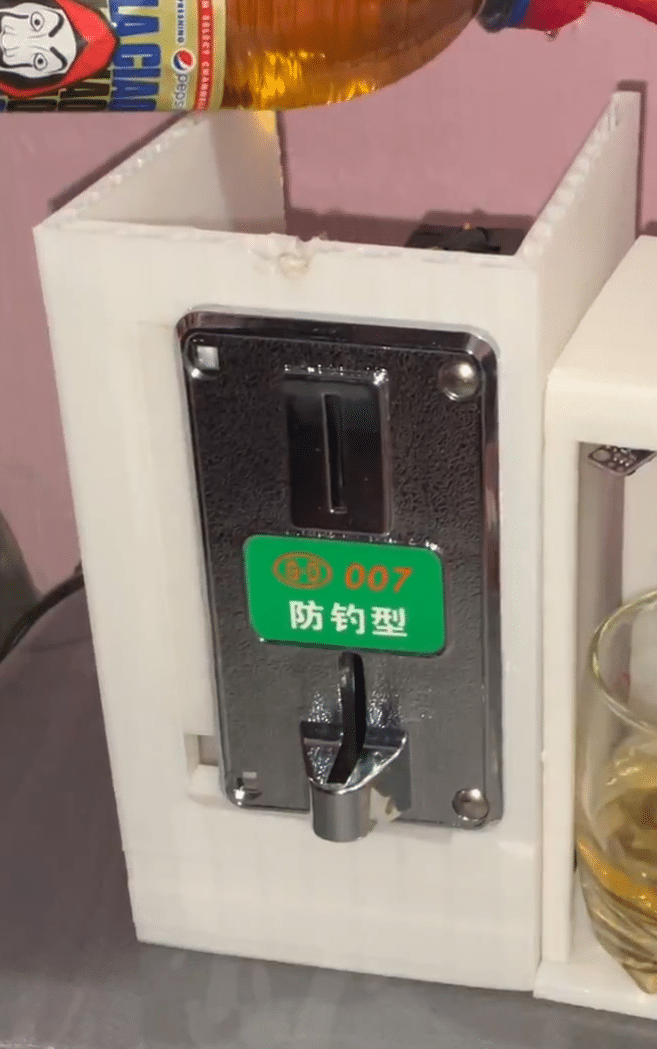 Next, pass the pipe connected to the container through the 3D printed part of the vending machine. This end will allow the liquid to flow into the drinking glass kept underneath (see below pictures).