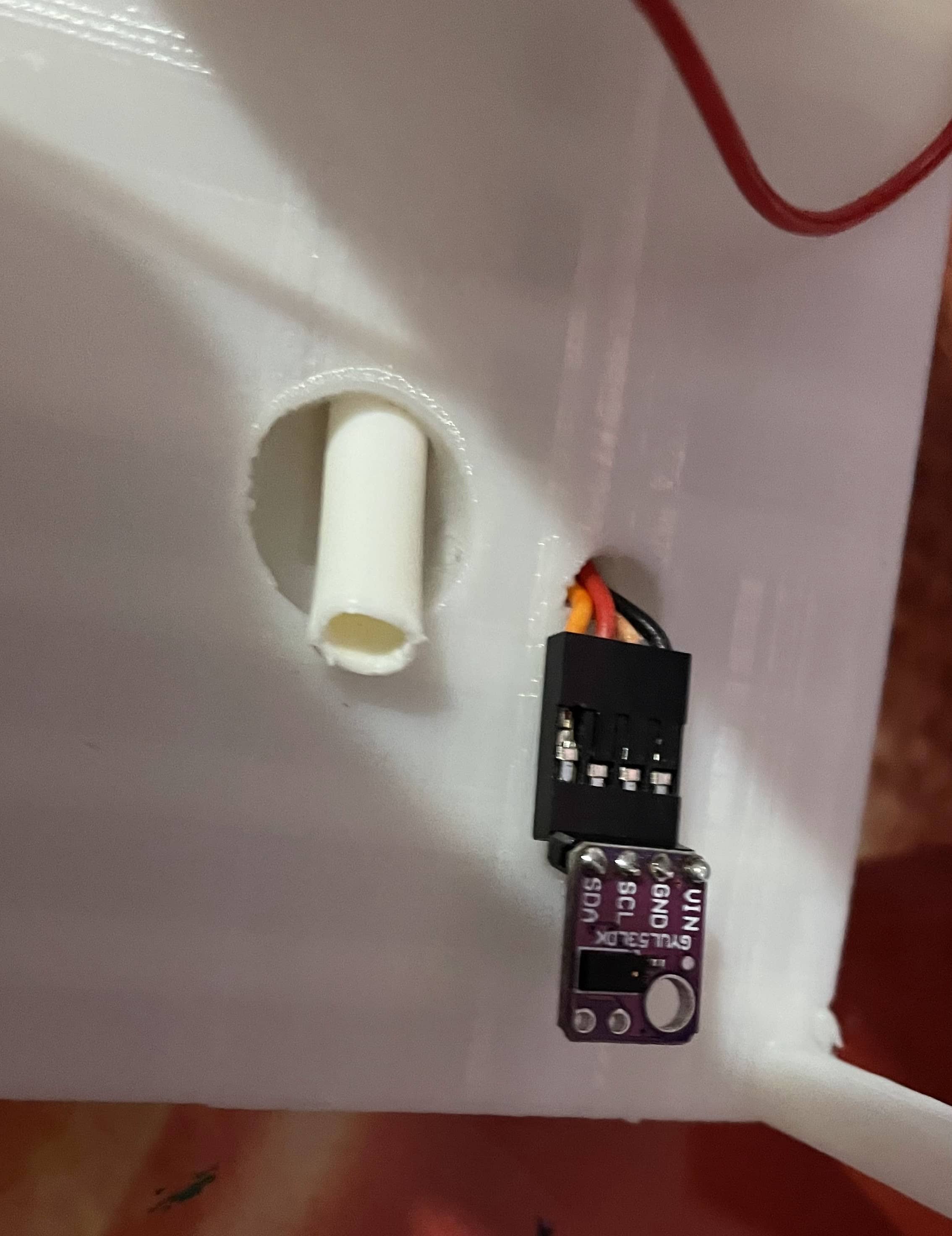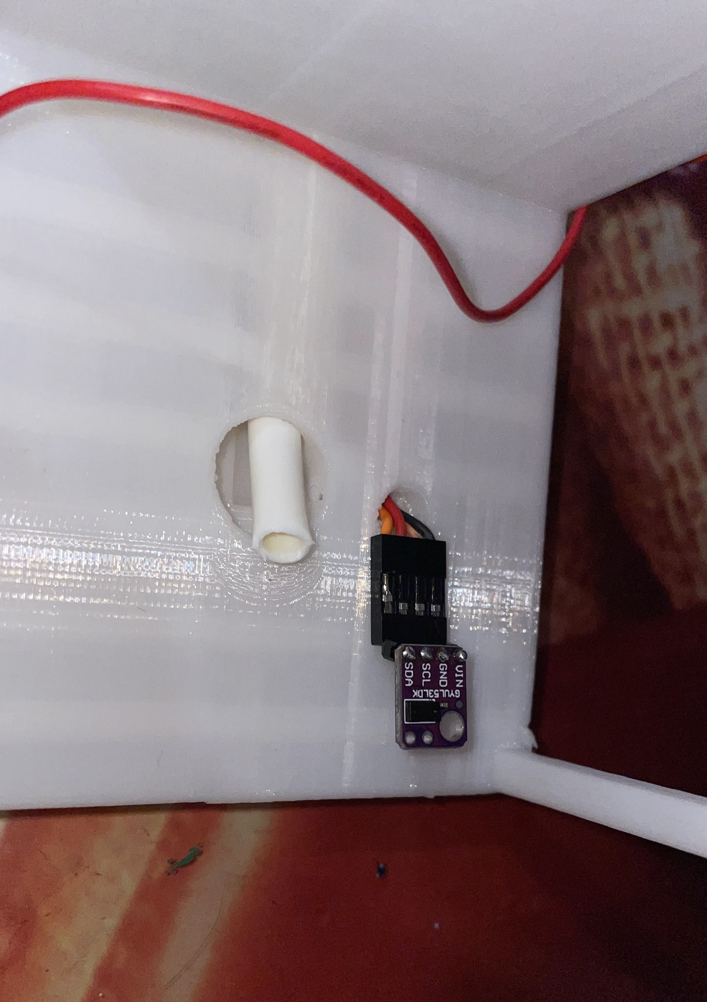 Now, pass the TOF sensor wires through the second hole (see pic below) and place it on top of the dispenser such that it remains straight and only allows the required amount of liquid to fill the drinking glass.