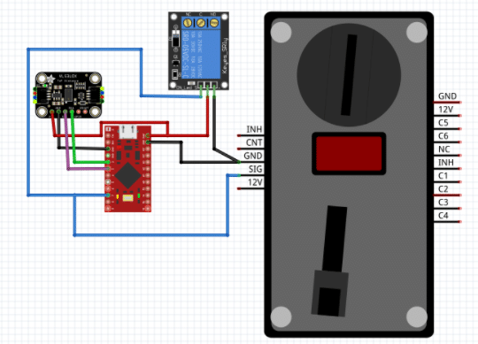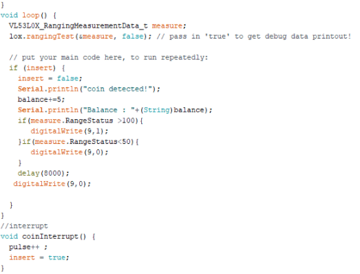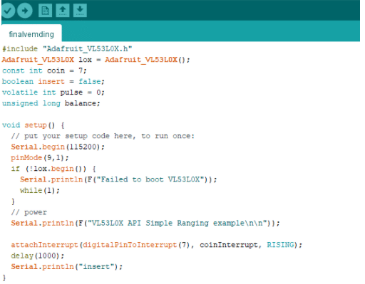 Define the pin for the interrupt of the coin pulse and create a setup function that checks the connection with the TOF sensor and starts the serial port for debugging. Next, create a loop for the solenoid valve when the correct coin is detected. It will check the liquid level in the glass and stop the valve when the required level gets achieved.