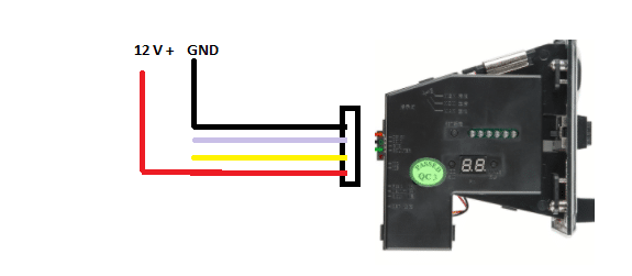 Attached to the coin acceptor are 4 wires: red (12V), black (GND) yellow (coin data) and white (counter data). Press the button on top of the coin acceptor for supplying 12V, until the red LED turns on. Insert a Rs 5 coin to turn off the red LED. The coin acceptor will recognise its validity and accept it.