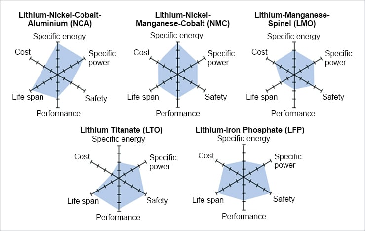 The active compounds in Li-ion batteries interact in complex and complementary ways. Therefore, understanding Li-ion cells’ chemistry is essential for selecting the most suitable one for an application. The six most common Li-ion battery cells are described below.