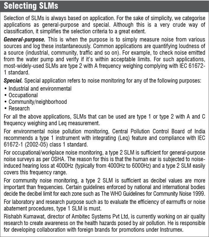 ANSI specifies SLM as three different types, namely, 0, 1 and 2. Type 0 is used in laboratories, type 1 for precision measurements in the field and type 2 for general-purpose measurements. Type 1 meter is preferred for designing cost-effective noise controls.