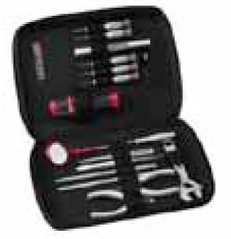 This comprehensive, portable tool kit is designed for IT/office equipment maintenance. It contains 15 precision tools in a small case with elastic support to secure the tools. Sized as a 23x30cm2 box, it contains the usual list of screwdrivers, pliers, mirror, tweezers, blade set and adjustable wrench. The kit can be easily carried around.