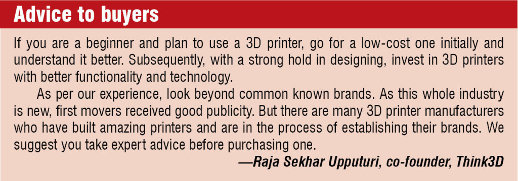 The only technology being offered for 3D printers under Rs. 100,000 is fused deposition modelling (FDM). “The major advancement happening with respect to FDM is scaling down of the cost of 3D printers using this technology,” informs Prudhvi Reddy, co-founder, Think3D.