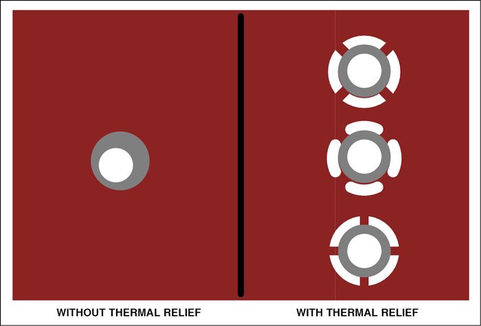 Fig. 1 shows the different thermal reliefs. These are normally required with power planes. If there is no thermal relief, the heat is dissipated at a high rate due to the larger surface area. The tip cools down rapidly and the joint is dry soldered. Temperature-controlled irons are useful in such a case as these can dump extra power into the bit without increasing the temperature. An uncontrolled iron will simply cool down. This also means that you would need different wattage irons to do a PCB if you are using unregulated irons. With a temperature-controlled soldering iron, you can easily adjust the temperature corresponding to the requirement of different joints.