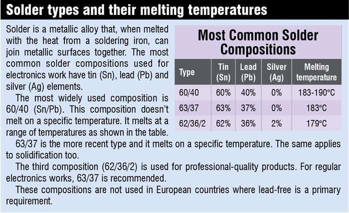 Typically, power rating of 15-25 watts is sufficient for most electronics work. A higher wattage does not mean that the iron runs hotter—it simply means that there is more power in reserve when required. If you are just soldering small components and ICs, 15 watts will be fine, but you may have to wait a bit in between joints for the tip to recover its temperature. If you are soldering larger components, especially ones with heat sinks (like voltage regulators), you will probably need a 25W or 30W iron. For soldering larger things like 10-gauge copper wire, motor casings or large heat sinks, you need a soldering iron with 50W or higher rating.