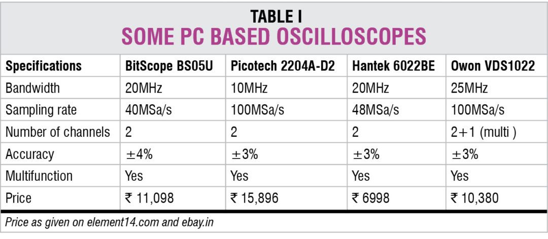A PC based oscilloscope is available at a much lower cost as compared to a conventional oscilloscope and is ideal for students. A typical PC based oscilloscope is shown in Fig. 3. Some commonly-available PC based oscilloscopes are listed in Table I.