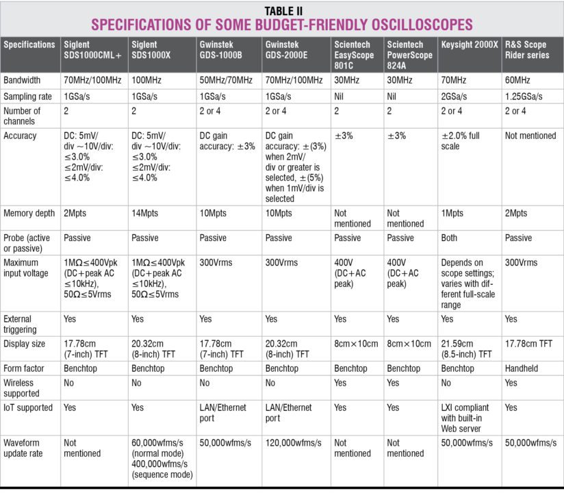 Technical specifications of some budget-friendly oscilloscopes are listed in Table II.