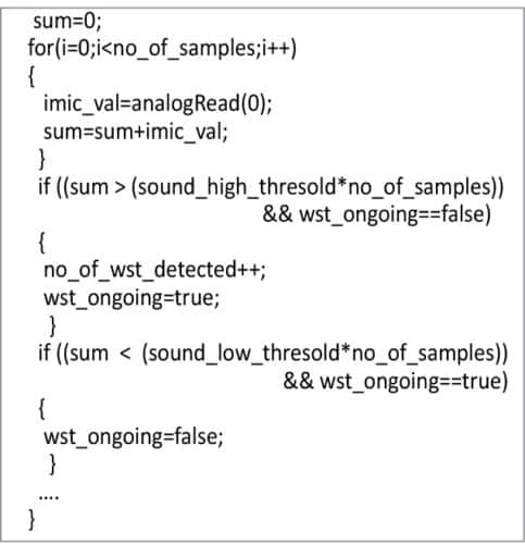 Whistle low detection is also important. If the detected flag is true and window sum value is less than the ‘low threshold,’ whistle low is declared. This section of the C code is shown in Fig. 3.