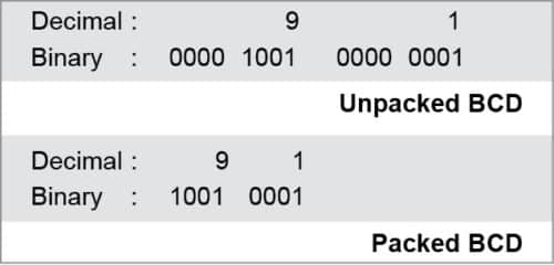 Binary-coded decimal (BCD) numbers are used to represent digital numbers, that is, zero to nine. In computer language, there are two terms used for BCD numbers: unpacked and packed. These two are shown in Fig. 1.