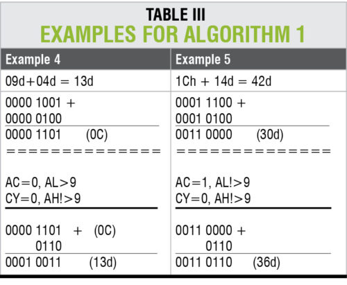Consider example 4 given in Table III. Required output 13d is obtained in decimal form without any error. This conventional algorithm works as follows. After addition process, condition 2 of Algorithm 1 is achieved. So the compiler adds 6 to A or AL register to obtain the result, which is I3d.