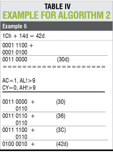 In Example 5 given in Table III, required result is 42d after adding the binary for 1Ch and 14d. But, algorithm 1 failed because of the following reasons. After addition process, value of AL is not greater than 9 and AC=1. Step 3 of algorithm 1 is satisfied and AL register is added with 6. But in this process, decimal value is seen as 36d instead of 42d.