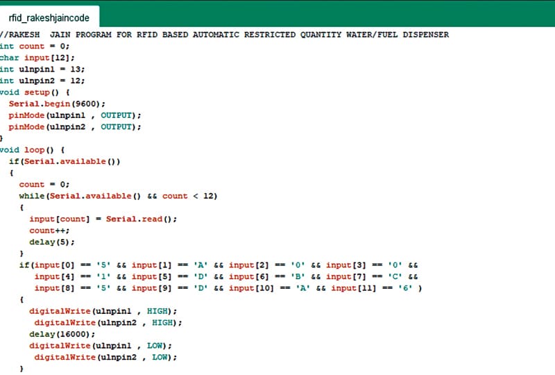 Next, prepare the code that checks the RFID card number and gives the signal to relay to dispense the liquid according to that RFID card. Here you need to change and set the card ID number according to your RFID card ID number. Fig. 4 shows a snippet of the source code.