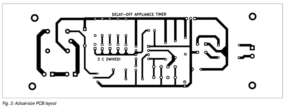 An actual-size, single-sided PCB layout for the delay-off appliance timer is shown in Fig. 3, with the component layout in Fig. 4. After assembling the components on the PCB, the circuit should be enclosed in a suitable cabinet, ensuring proper openings are provided at the rear for mounting and ventilation. The switches (S1 through S7) should be mounted on the front panel of the cabinet and connected to the PCB using external wires.