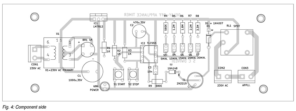 Fig. 2 shows the circuit diagram of the delay-off appliance timer. It is powered by 230V AC mains supply, which is stepped down to 12V, 500mA by a transformer, rectified using a bridge rectifier (BR1), filtered by capacitor C1 (1000µF, 35V), and regulated to 12V using an LM7812 (IC1). This regulated 12V supply powers the remaining circuit.