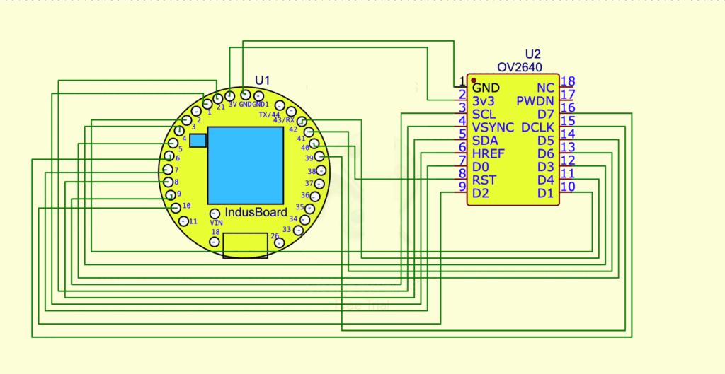 - Setup: Connected the OV2640 camera to the IndusBoard Coin V2 as per the pin assignments. Powered the board via USB or using a 3.7 or 3.3V battery using the 3V and GND pins on the coin.