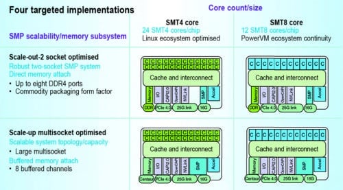 Power9 will be available in two basic designs: a 24 SMT4 processor and a 12 SMT8 processor. The 24 SMT4 processor will be optimised for the Linux ecosystem and will target web service companies such as Google, which need to run across several thousand machines. It will feature four threads.