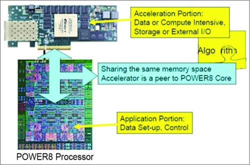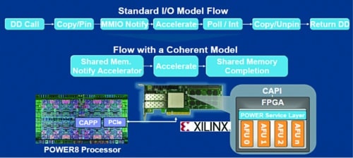 Prior to CAPI, an application calls the device driver to utilise the FPGA accelerator. The device driver performs a memory mapping operation. CAPI connects a custom acceleration engine to the coherent fabric of the Power9 chip. Because FPGAs are reconfigurable, hardware can be customised without the traditional costs of hardware fabrication.