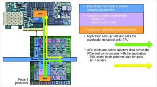The Coherent accelerator processor proxy (CAPP) unit maintains a directory of all cache lines held by the off-chip accelerator, allowing it to act as the proxy that maintains architectural coherence for the accelerator across its virtual memory space. A power service layer (PSL) resides on the FPGA alongside the acceleration engine. It works in concert with the CAPP unit across a PCIe connection. The PSL provides a straightforward command to the client-written accelerator, which grants access to coherent memory.
