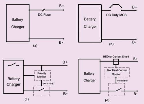 Some chargers use an MCB rated for the given DC duty at the output of the charger to provide the above protections. However, the MCB is rated only for a few fault events and cannot be reused indefinitely over and over again to break the same current each time reliably. Also, general MCBs are better suited for AC currents, which contain a natural zero crossing that naturally reduces the instantaneous current flow and helps break the current flow with lesser damage to the breaker elements.