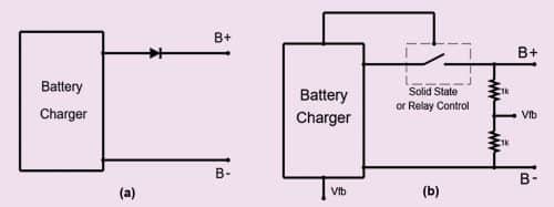In some cases, battery chargers may be subjected to battery voltages higher than their maximum output voltages. In such cases, there is a chance of reverse current flow into the charger electronics, or higher voltage stresses across the main switching elements. The most common way to protect against this is to include a diode of rated current forward biased towards the positive terminal of the charger, that is, with its cathode pointing towards positive terminal of the charger.