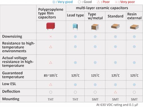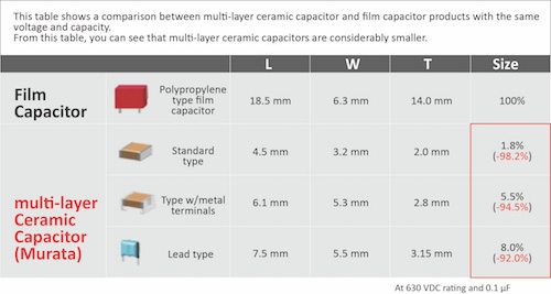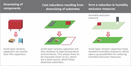 These materials provide actual examples of the differences between film capacitors and multi-layer ceramic capacitors, and how downsizing and cost reductions can be achieved.