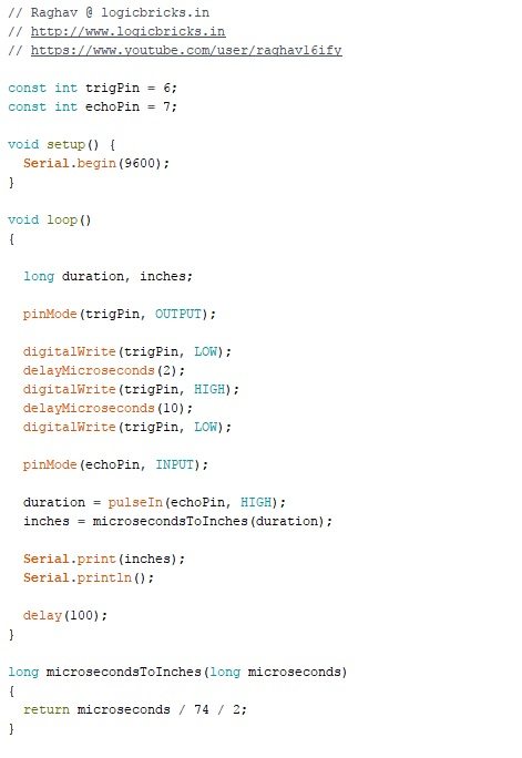 Arduino Board pin 7 – Echo Pin Ultrasonic Sensor- Arduino Board pin 6 – Triger Pin Ultrasonic Sensor
