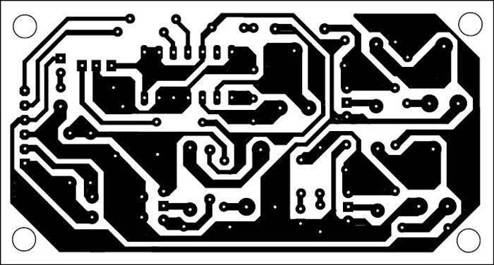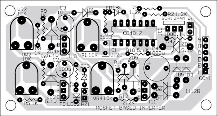 An actual-size, single-side PCB for the pure sine wave inverter circuit is shown below.