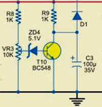 If the battery is discharged to zero volts repeatedly, the battery life will decrease. The low-battery cut-off circuit consists of transistor T10, preset VR3, Zener diode ZD4, resistors R8 and R9, capacitor C3, and diode D1.