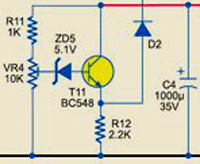 When no load is connected, the voltage at the 12V tap will also increase. This voltage is rectified by the full-wave bridge rectifier comprising diodes D3 through D6, filtered by capacitor C4 and given to transistor T11.