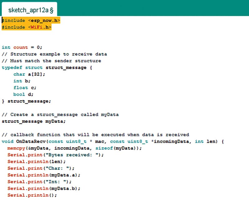 To prepare the code for the receiver, first, initialize the ESP-NOW library and then check the incoming message. In the loop, turn the relay pin on or off based on the message received. See Fig. 9 for the snippet of the source code of the receiver.
