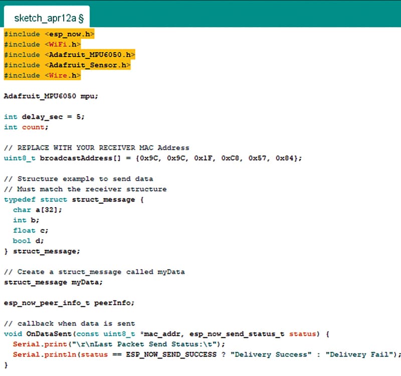 So, in the code, first, you need to initialize the ESP-NOW library and then the Addafruit mpu6050 library. Next, you need to configure the Mac address to the receiver to pair and communicate with.