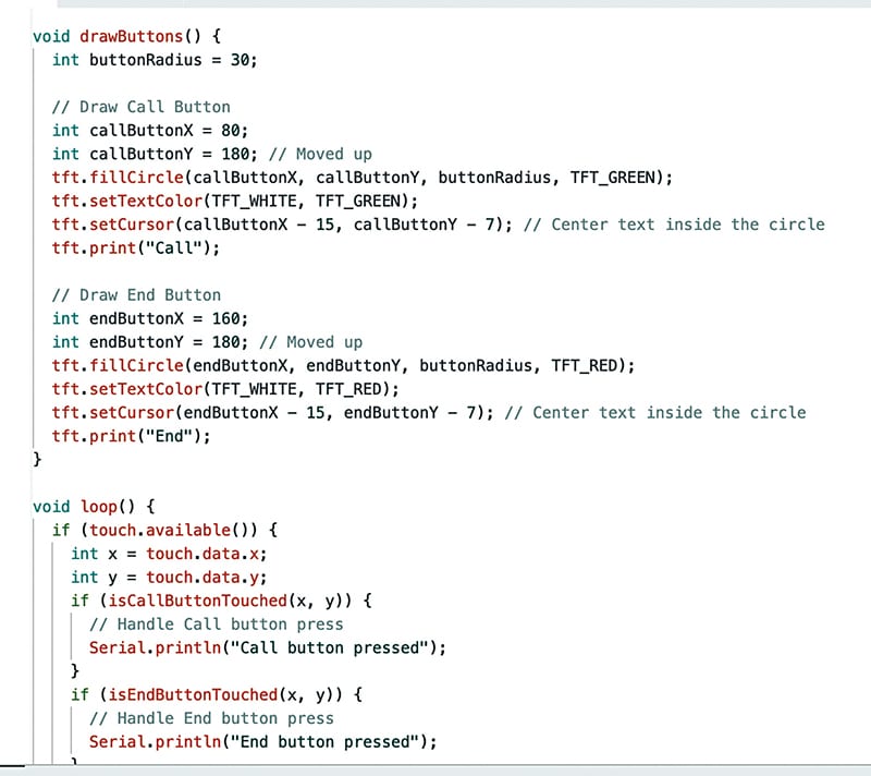 The code will check the touchpoints for each number and determine whether the touchpoint matches the range of the buttons displayed on the screen. A function will store the number as a string and display it as the dialled number.