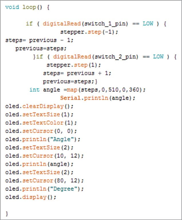 Next, create a loop function and include ‘if ( ) condition’ to check the state of the pushbutton. When if ( ) condition in code says true, stepper motor moves one step and stays there until the condition turns false (which happens when the switch is not pressed).