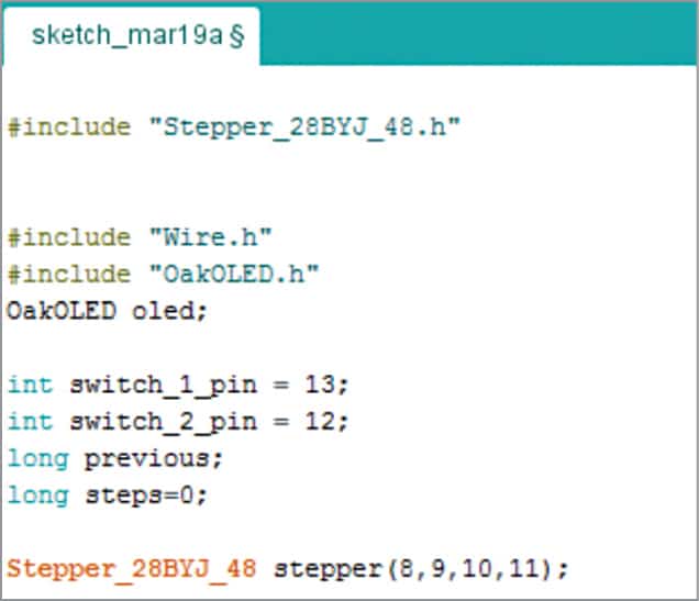 Include stepper motor libraries and declare the variables needed to store different values as shown in Fig. 4. After this create a setup ( ) function, which is shown in Fig. 5.