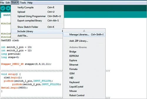 The firmware (digital_protractor.ino) for this project is written in Arduino programming language. First, add relevant software library to Arduino IDE from Include Library as shown in Fig. 2.