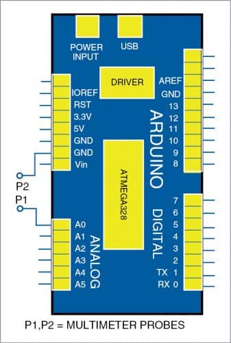 The simple arrangement required for voltage measurements is shown in Fig. 2. Voltage measuring probes P1 and P2 are connected across analogue pin A0 and GND pin of Arduino Uno.