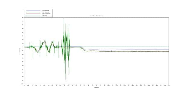 - From ~4.75 to 5.75 the pcb was shaken laterally through the y-axis of the accelerometer. Figure 5 once again shows the accelerometer data being filtered. The coefficient associated with the complementary filter can probably be increased closer to one to remove the small ripples on the filter output due to the accelerometer data in this timeframe.