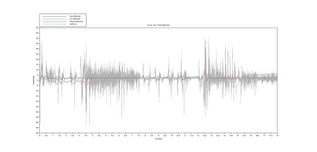 Figures 7 and 8 are plots of data recorded while running the robot. In Figure 7, the accelerometer data is gray despite the legend stating green. The accelerometer data was selected when creating the image, making it easier to see the gyro data and filter output.