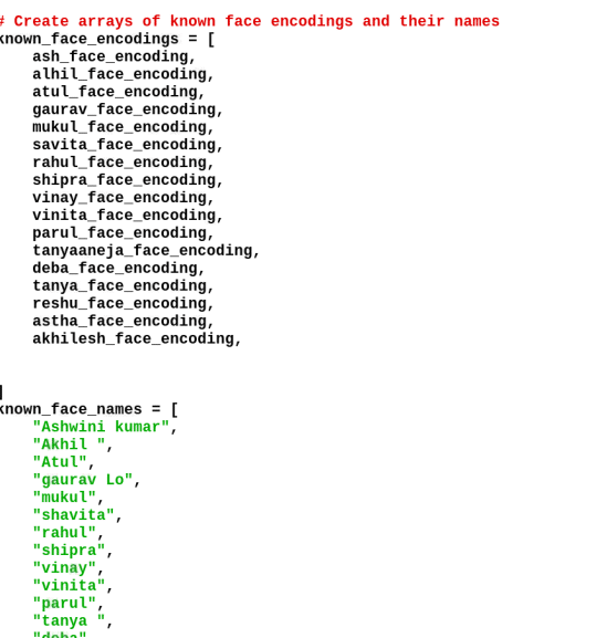 Next, set the image file name of each person we want to be recognised. If we don’t have an image of the person in the database then it is considered as unknown. After that we will create an array having the list of names and images of all identified people. The name and image need to be in the same order.
