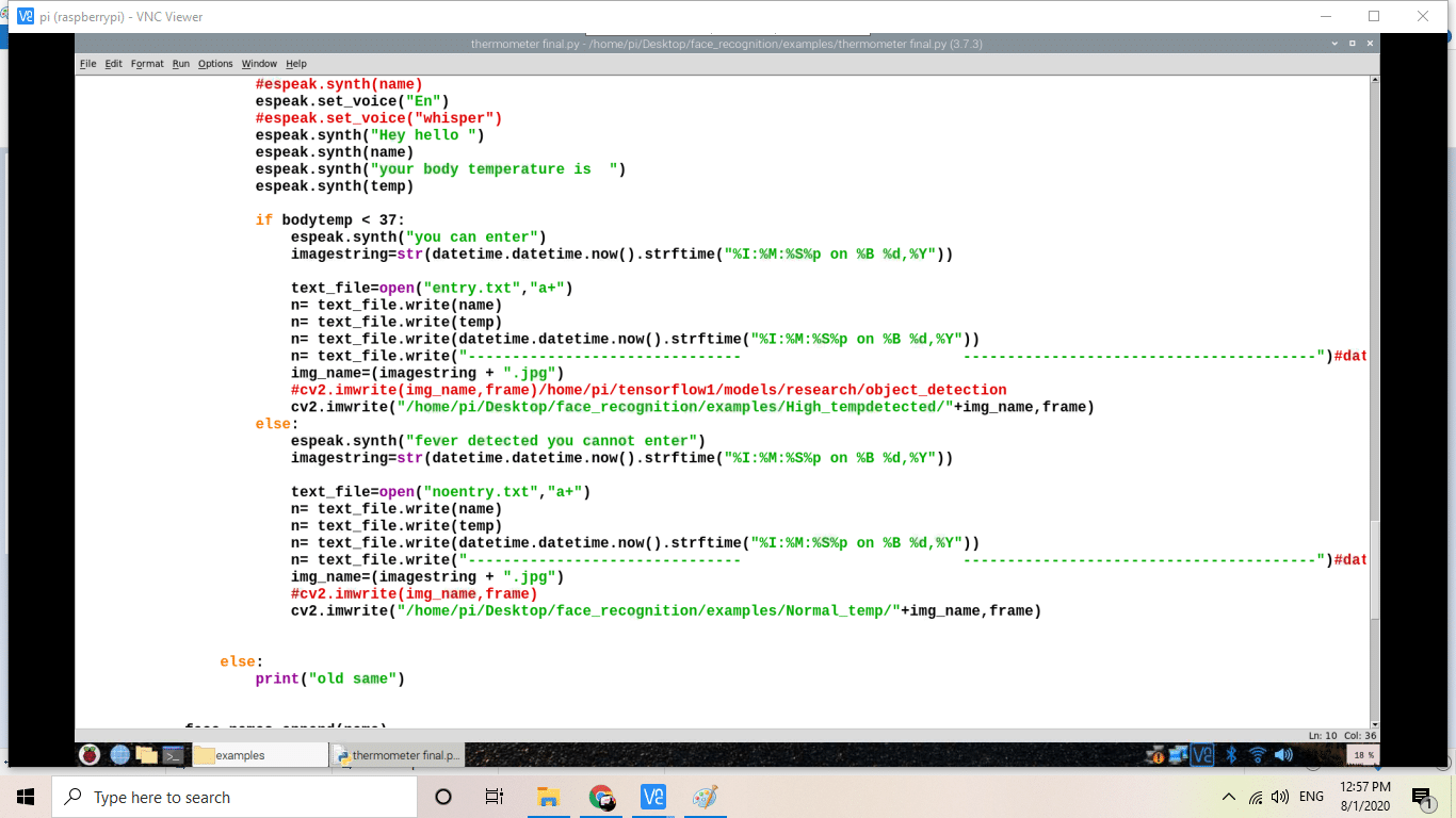 Next, the if() statements that we had written check whether the temperature is greater than 37 degrees Celsius or not. If the temperature is detected to be greater than that, then the system tells the person to not enter the area. It also captures the person’s image and temperature and saves them in a database folder with a timestamp.