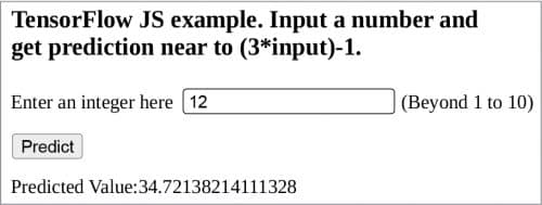 Let us understand this code a bit. The first part of the code is purely the HTML code for the input textbox, the Predict button, and the output section. The ‘script’ portion is where the TensorFlow.js magic works. It just creates a very simple, linear regression sort of one-layer sequential dense model.