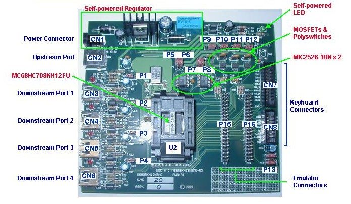 This manual describes a reference design of a Universal Serial Bus Hub keyboard. The design implements multimedia keys, function keys, power management (power, wake and sleep) keys, and a “000” key (one key strike, three “000” generated). The core of the design is MC68HC08KH12 microcontroller which includes a USB hub controller and an embedded USB device. This makes the device suitable for hub keyboards applications. Some functions of the hub include power management, device connect and disconnect detection and bus fault detection and recovery. The keyboard successfully passes USB compliance test and compatibility tests for Windows 98, ME, 2000 and XP. More on this Reference Design