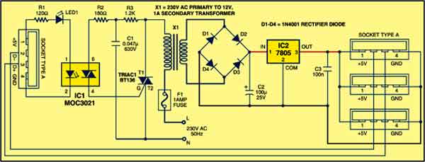 In USB, two different types of connectors are used: type A and type B. The circuit presented here is an add-on unit, designed to add more power to a USB supply line (type-A). When power signal from the PC (+5V) is received through socket A, LED1 glows, opto-diac IC1 conducts and TRIAC1 is triggered, resulting in availability of mains supply from the primary of transformer X1. Now transformer X1 delivers 12V at its secondary, which is rectified by a bridge rectifier comprising diodes D1 through D4 and filtered by capacitor C2.